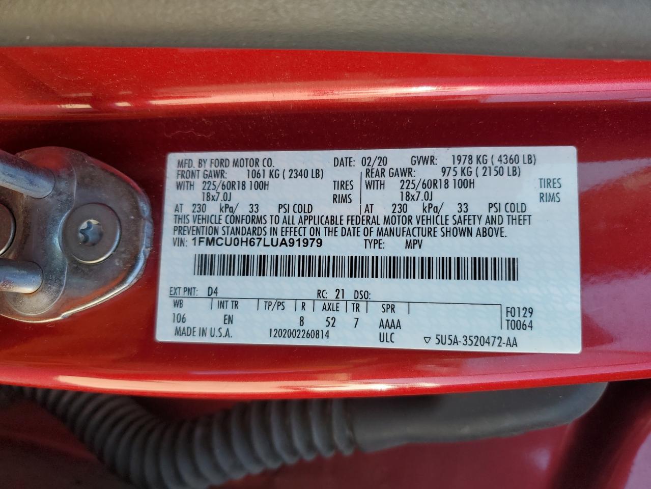 Колір ЧервонийЦиліндри 3VIN 1FMCU0H67LUA91979Стан Заводиться та їде (перевірено)Ушкодження Передня або задняДата аукціону 2025-11-03