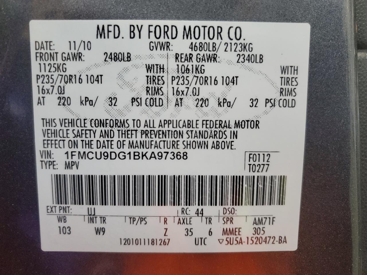 Колір СірийЦиліндри 6Привід Повний привідVIN 1FMCU9DG1BKA97368Стан НевідомоУшкодження Задня