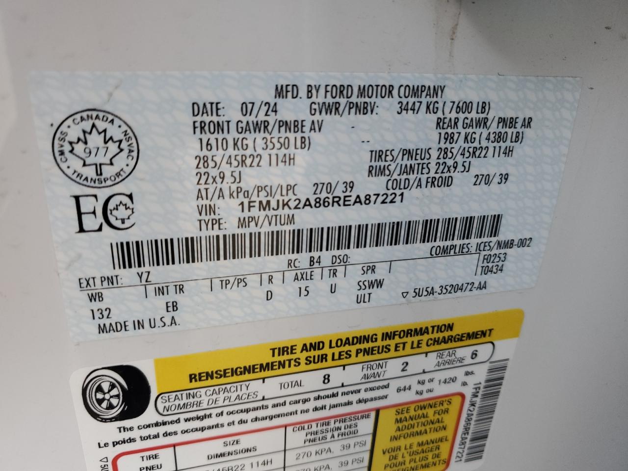 Колір БілийЦиліндри 6Привід 4x4 з заднім приводомVIN 1FMJK2A86REA87221Стан Заводиться та їде (перевірено)Ушкодження З боківДата аукціону 2025-11-06