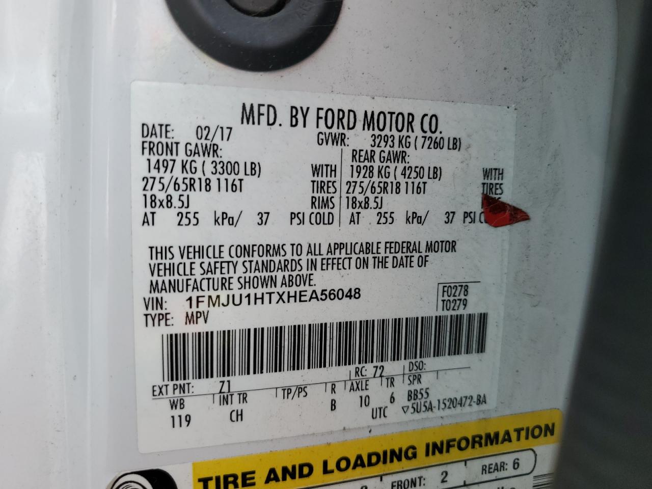 Колір БілийЦиліндри 6Привід Задній привідVIN 1FMJU1HTXHEA56048Стан Заводиться та їде (перевірено)Ушкодження Механічні пошкодженняДата аукціону 2025-11-03