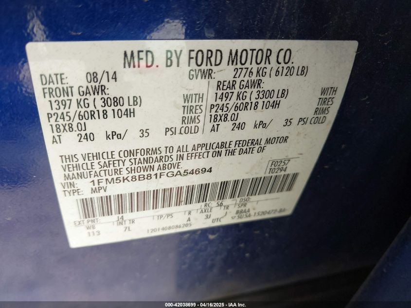 FORD EXPLORER 3.5 2015 р.в., Повний привід (1FM5K8B81FGA54694) з США