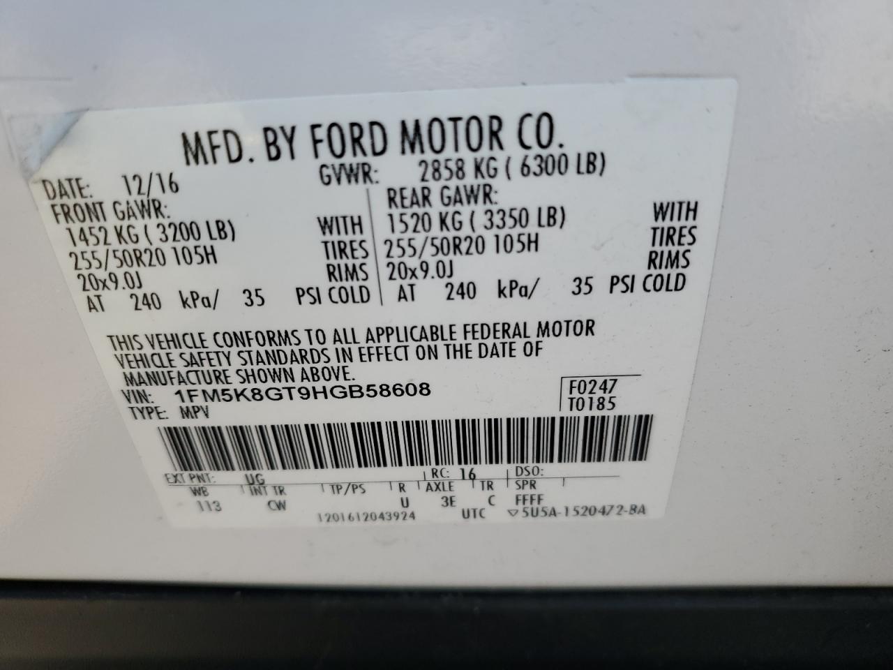 Колір БілийЦиліндри 6Привід 4x4 з переднім приводомVIN 1FM5K8GT9HGB58608Стан Заводиться та їде (перевірено)Ушкодження Передня або задняДата аукціону 2025-11-03
