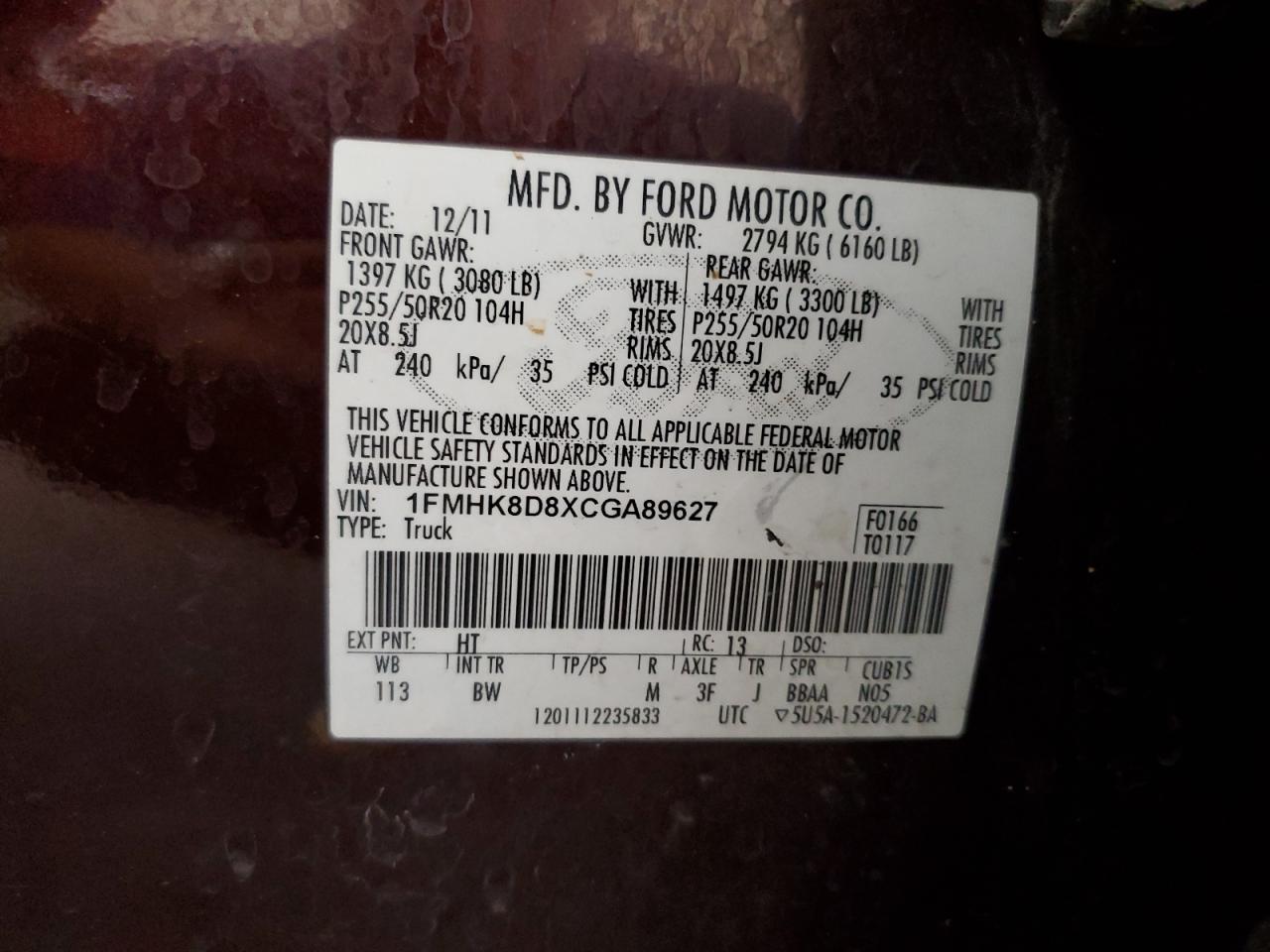 Колір БордовийЦиліндри 6Привід 4x4 з переднім приводомVIN 1FMHK8D8XCGA89627Стан Заводиться та їде (перевірено)Ушкодження Задня