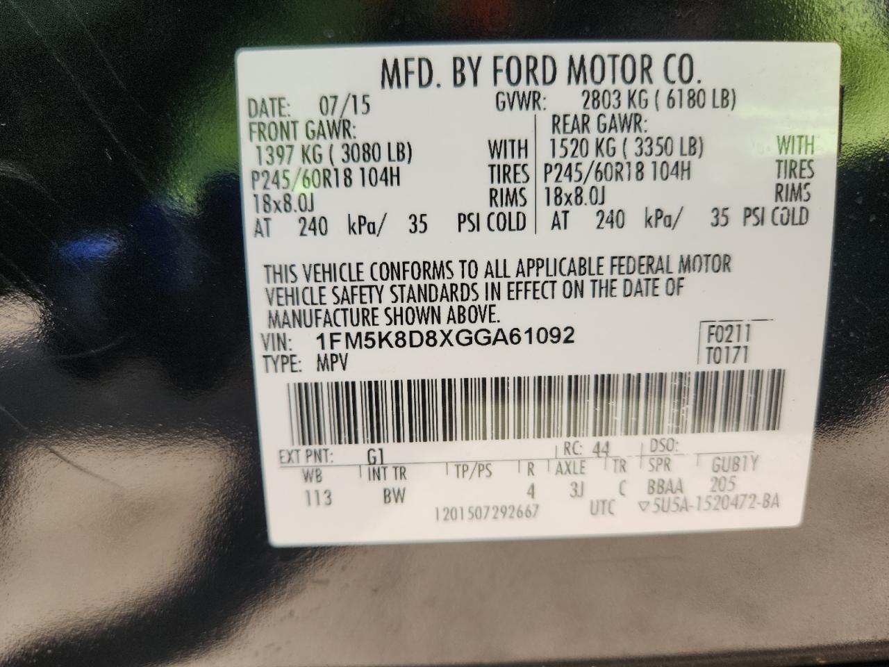 FORD EXPLORER 3.5 2016 р.в., 4x4 з переднім приводом (1FM5K8D8XGGA61092) з США