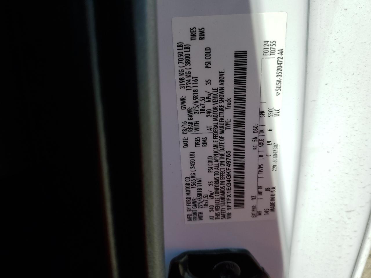 FORD F-150 3.5 2016 р.в., 4x4 з заднім приводом (1FTFX1EG4GKF49765) з США