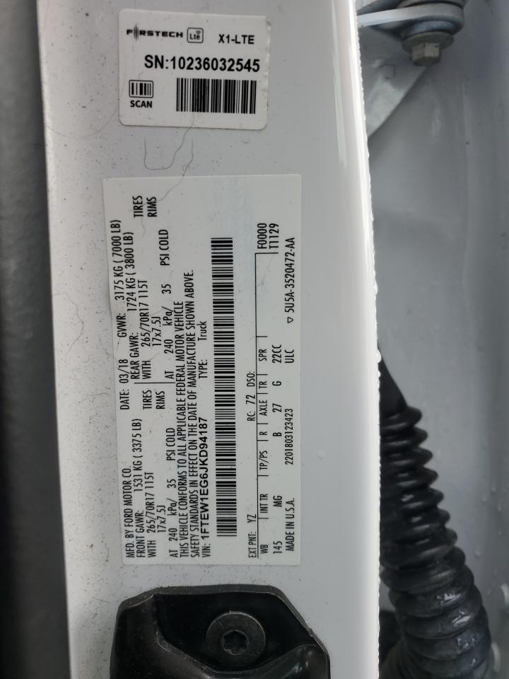 Колір БілийЦиліндри 6Привід 4x4 з заднім приводомVIN 1FTEW1EG6JKD94187Стан Заводиться та їде (перевірено)Ушкодження Град