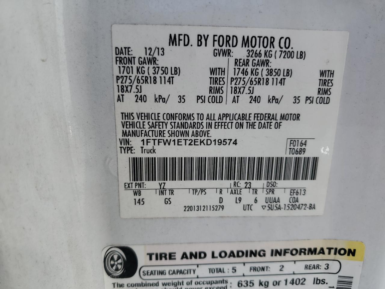 Колір БілийЦиліндри 6Привід 4x4 з заднім приводомVIN 1FTFW1ET2EKD19574Стан НевідомоУшкодження Передня або задня