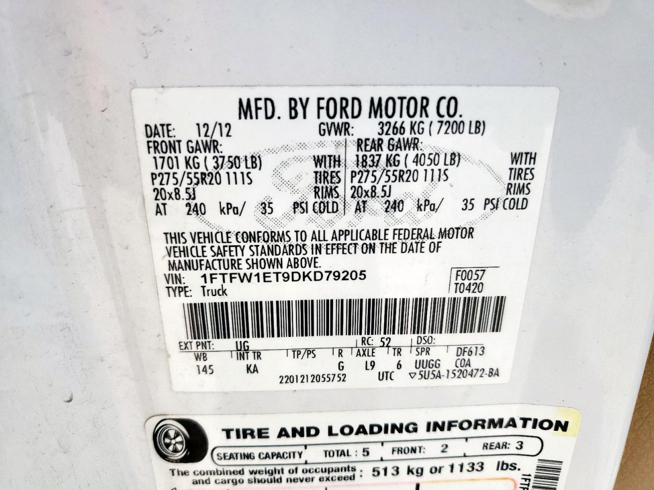 Колір БілийЦиліндри 6Привід 4x4 з заднім приводомVIN 1FTFW1ET9DKD79205Стан НевідомоУшкодження Передня або задня