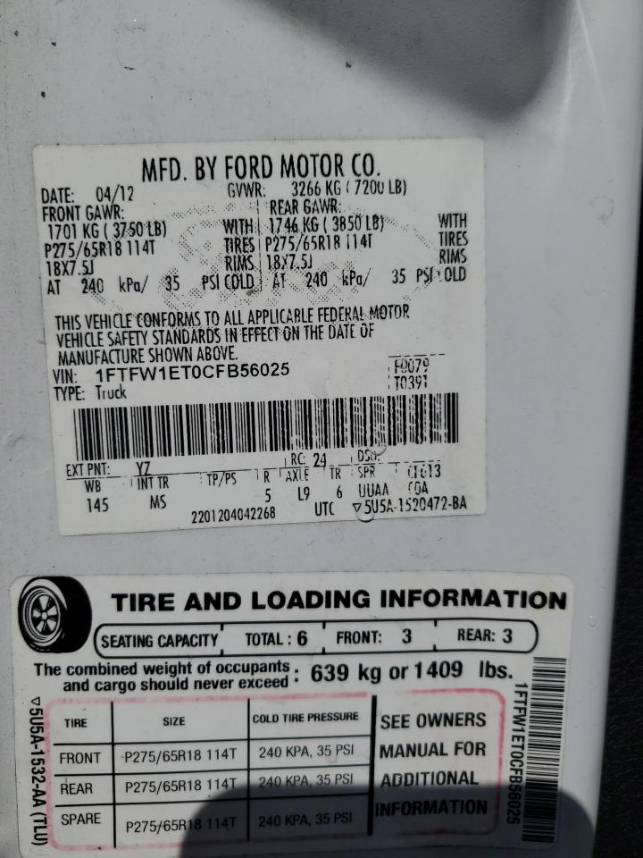 Колір БілийЦиліндри 6Привід 4x4 з заднім приводомVIN 1FTFW1ET0CFB56025Стан Заводиться та їде (перевірено)Ушкодження Передня або задня