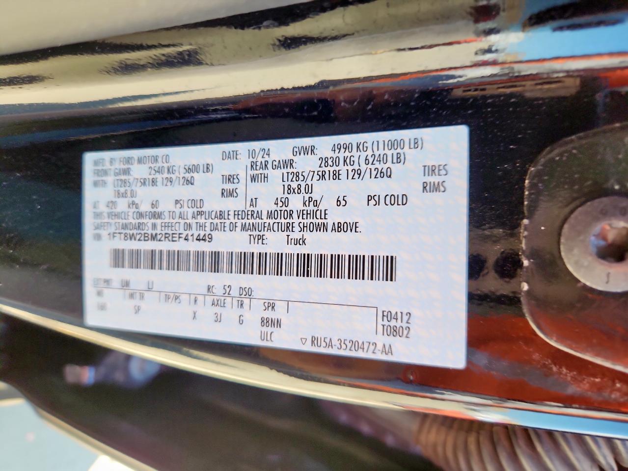 Колір ЧорнийЦиліндри 8Привід 4x4 з заднім приводомVIN 1FT8W2BM2REF41449Стан Заводиться та їде (перевірено)Ушкодження Передня або задняДата аукціону 2025-11-06