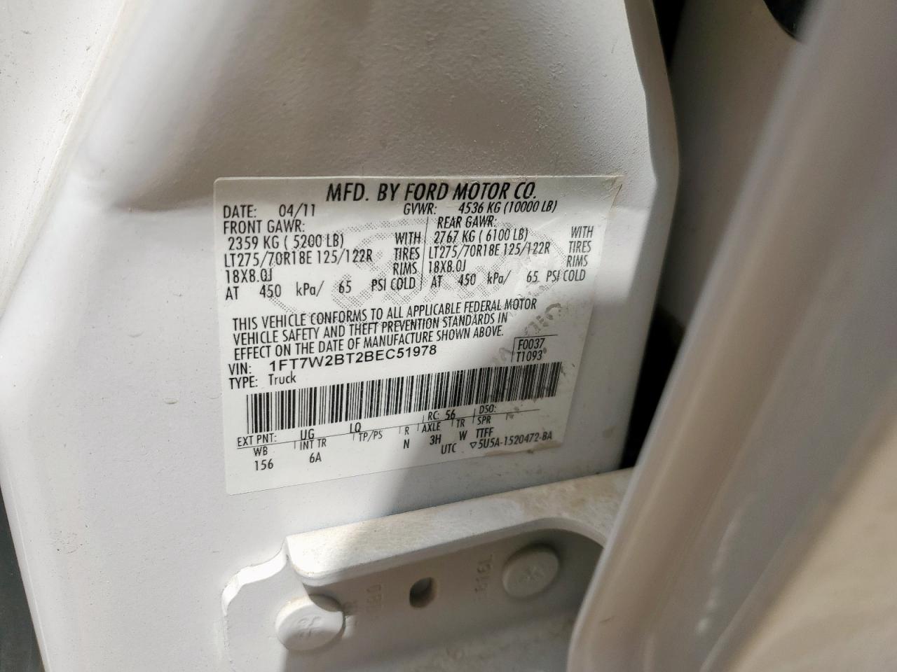 Колір БілийЦиліндри 8Привід 4x4 з заднім приводомVIN 1FT7W2BT2BEC51978Стан НевідомоУшкодження Передня або задня