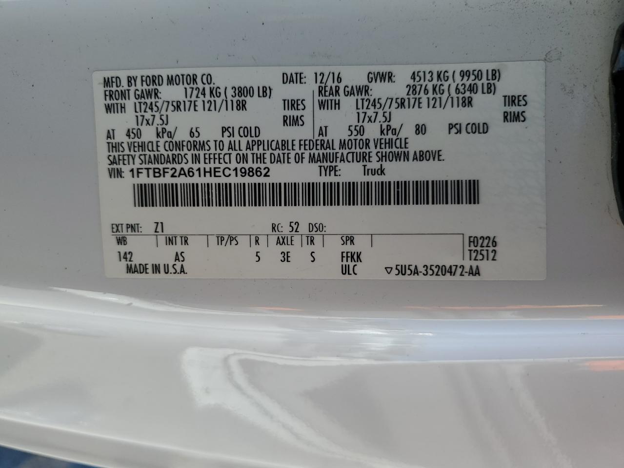 Колір БілийЦиліндри 8Привід Задній привідVIN 1FTBF2A61HEC19862Стан Заводиться та їде (перевірено)Ушкодження Передня або задняДата аукціону 2025-11-06