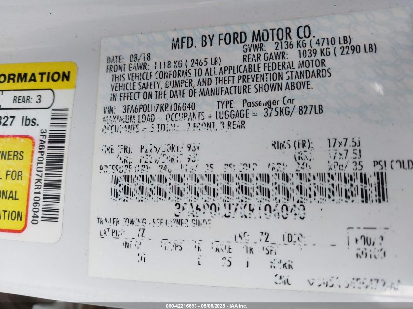 FORD FUSION HYBRID 2.0 2019 р.в., Передній привід (3FA6P0LU7KR106040) з США