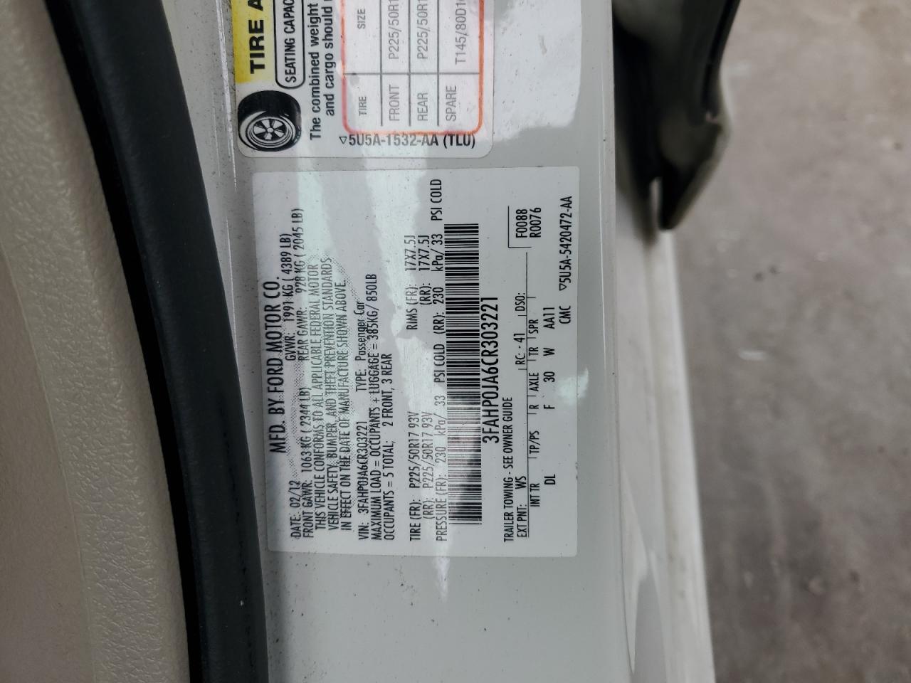 Колір БілийЦиліндри 4VIN 3FAHP0JA6CR303221Стан Заводиться та їде (перевірено)Ушкодження Передня або задняДата аукціону 2025-11-11