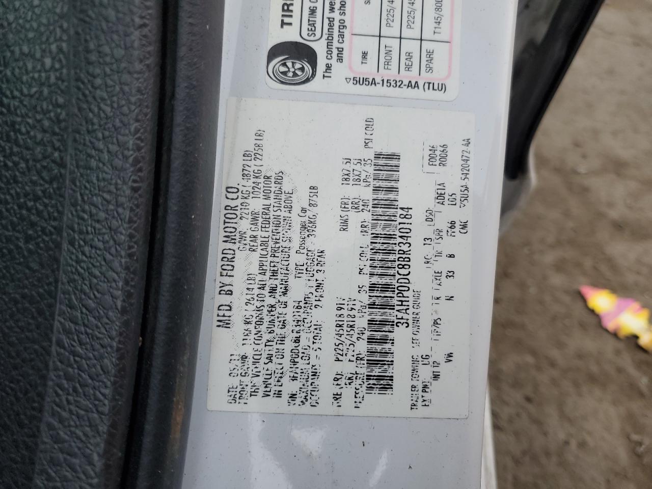 Колір БілийЦиліндри 6Привід Повний привідVIN 3FAHP0DC8BR340184Стан НевідомоУшкодження Передня або задня
