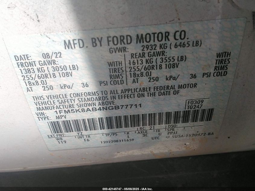Колір БілийЦиліндри 6Привід Повний привідVIN 1FM5K8AB4NGB77711Стан ЗаводитьсяУшкодження Передня або задня