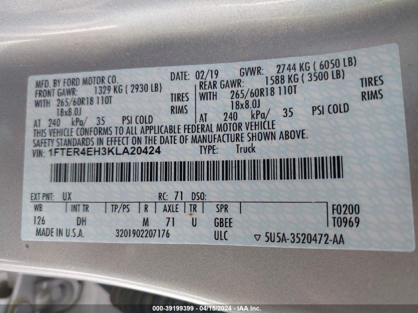FORD RANGER 2.3 2019 р.в., (1FTER4EH3KLA20424) з США