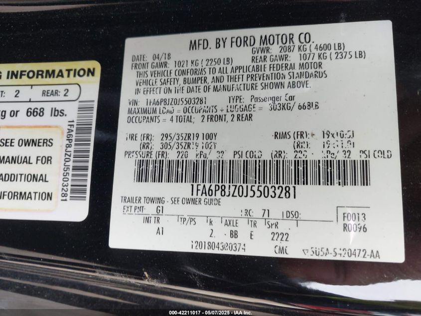 Колір ЧорнийЦиліндри 8Привід Задній привідVIN 1FA6P8JZ0J5503281Стан СтаціонарноУшкодження Передня або задня