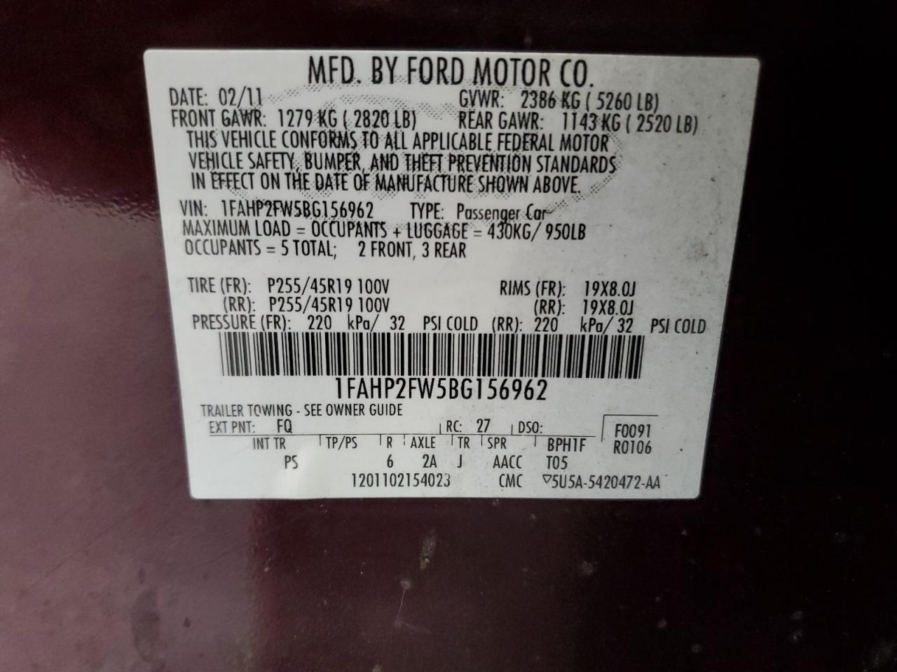 Колір БордовийЦиліндри 6VIN 1FAHP2FW5BG156962Стан Заводиться та їде (перевірено)Ушкодження Передня або задняДата аукціону 2025-10-31