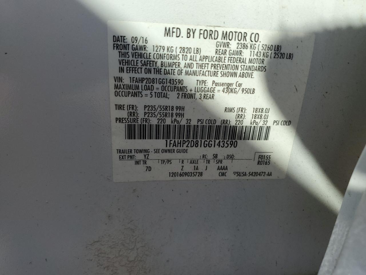 FORD TAURUS 3.5 2016 р.в., (1FAHP2D81GG143590) з США