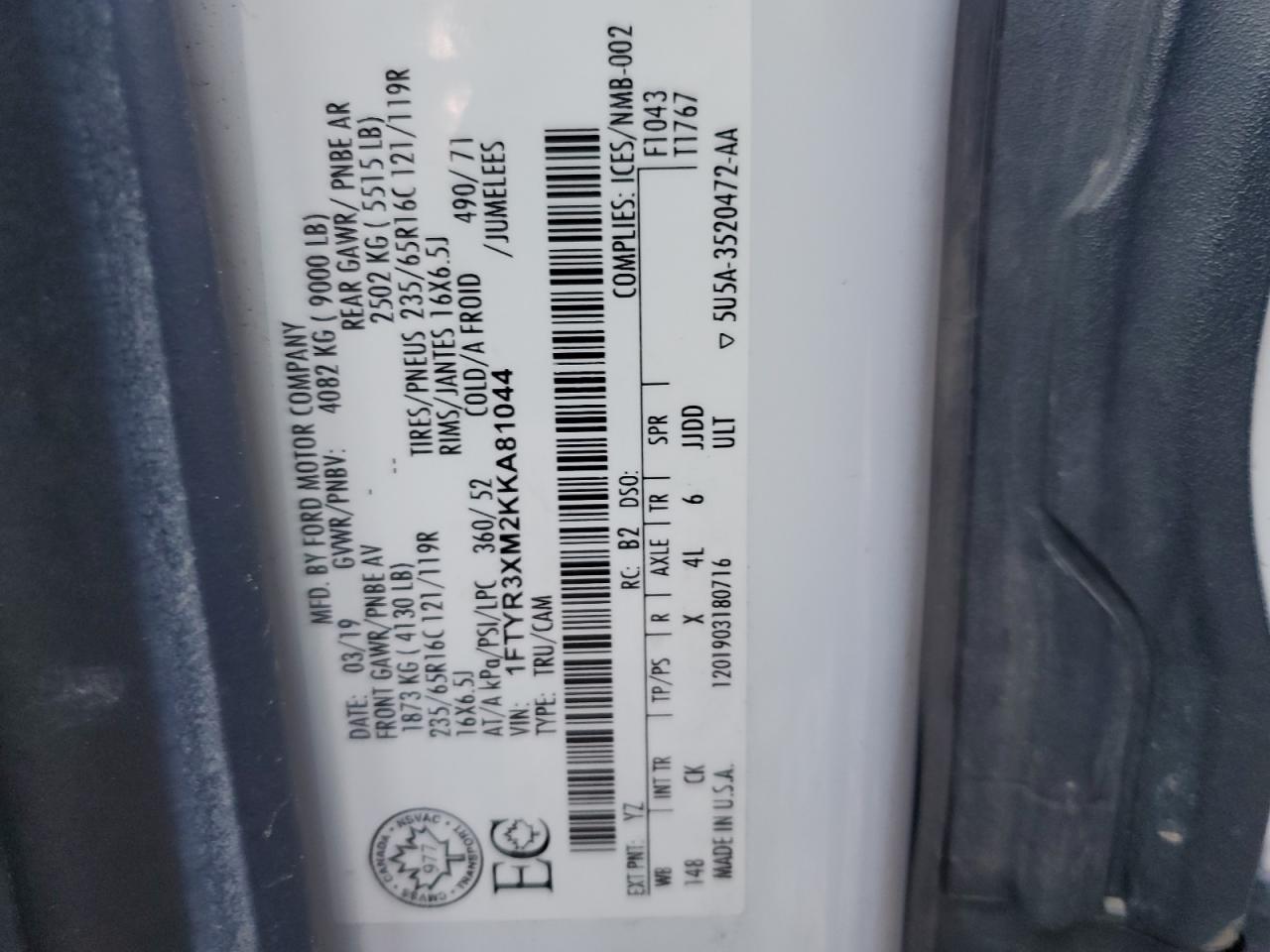 FORD TRANSIT 3.7 2019 р.в., Задній привід (1FTYR3XM2KKA81044) з США