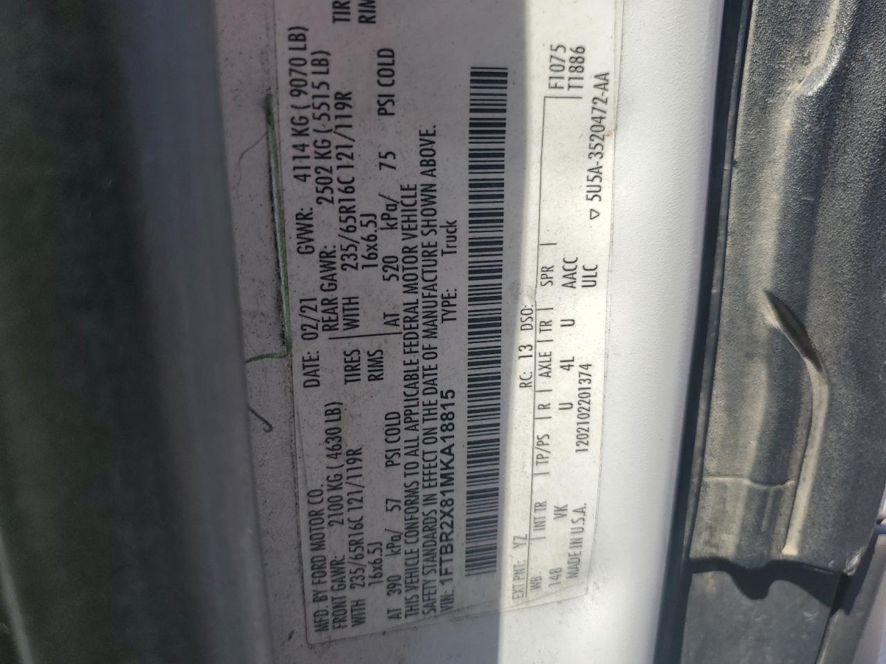 FORD TRANSIT 3.5 2021 р.в., Повний привід (1FTBR2X81MKA18815) з США