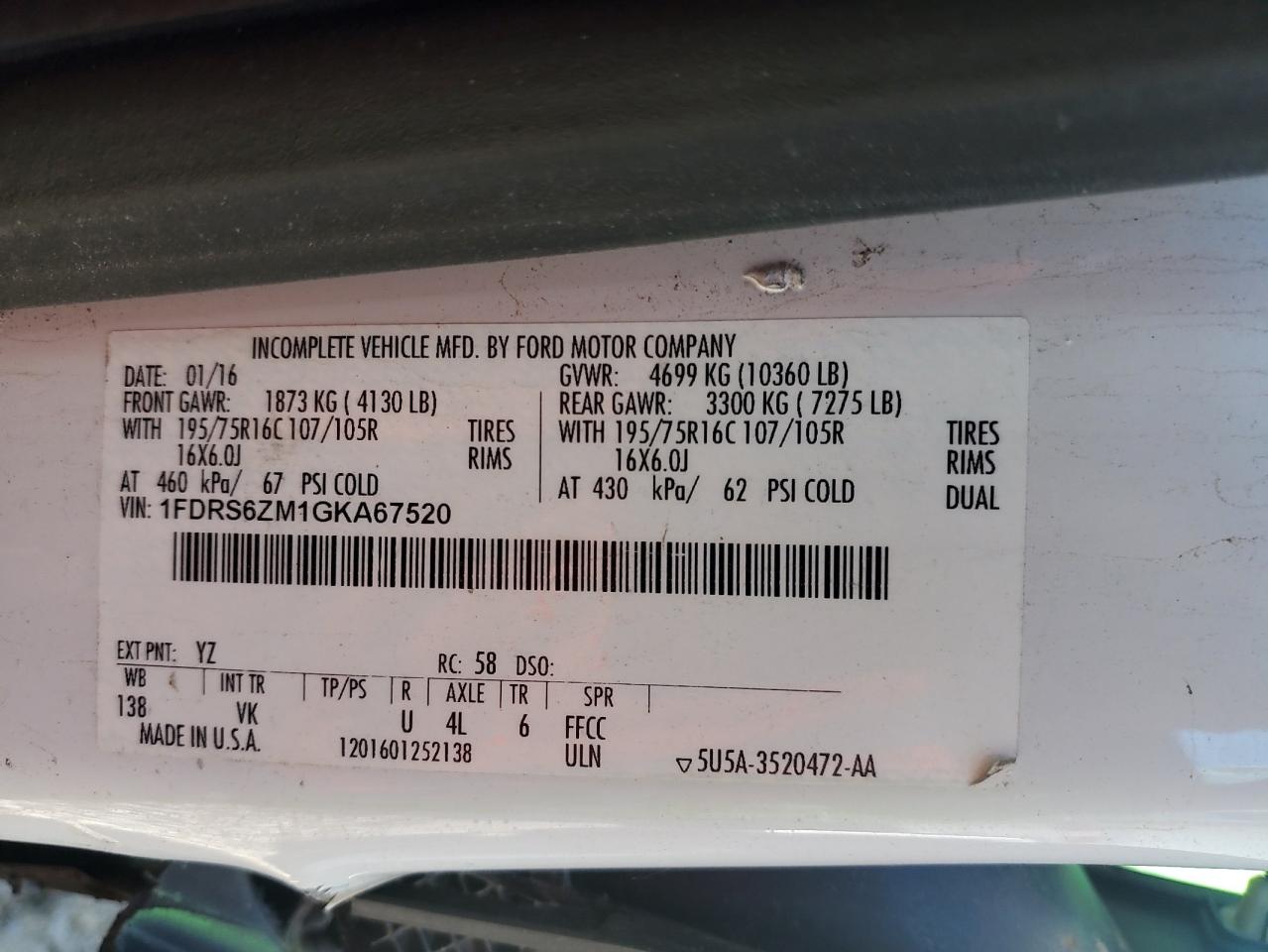 Колір БілийЦиліндри 6Привід Задній привідVIN 1FDRS6ZM1GKA67520Стан НевідомоУшкодження З боків