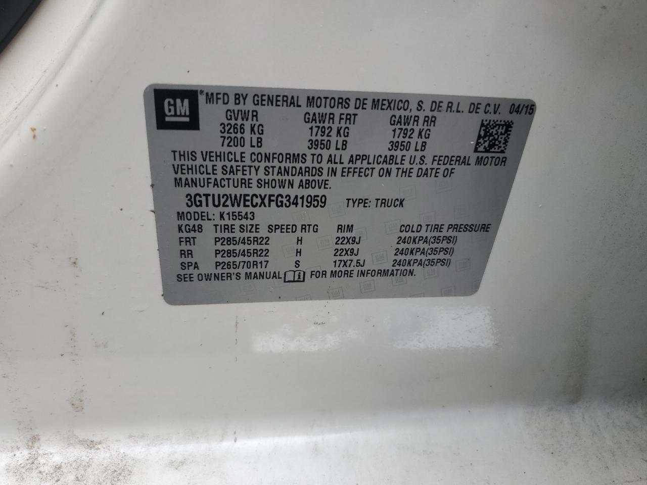 Колір БілийЦиліндри 8Привід 4x4 з заднім приводомVIN 3GTU2WECXFG341959Стан НевідомоУшкодження Зняття деталейДата аукціону 2025-11-03