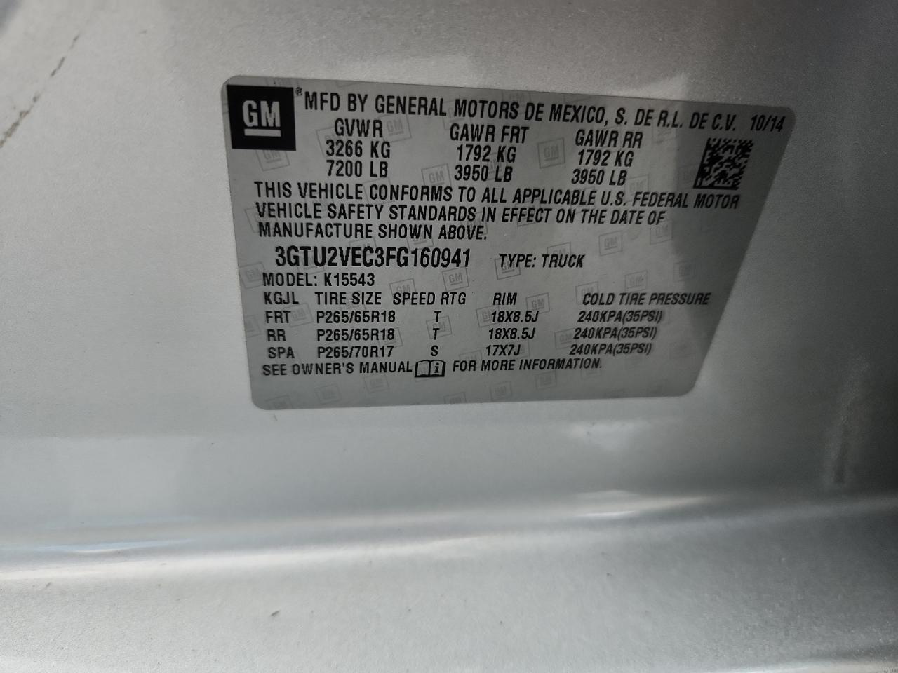 GMC SIERRA 1500 5.3 2015 р.в., 4x4 з заднім приводом (3GTU2VEC3FG160941) з США