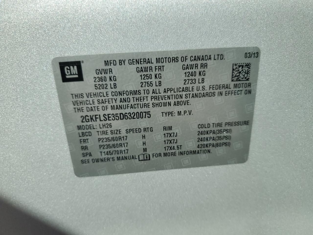 Колір СрібнийЦиліндри 6VIN 2GKFLSE35D6320075Стан Заводиться та їде (перевірено)Ушкодження Задня