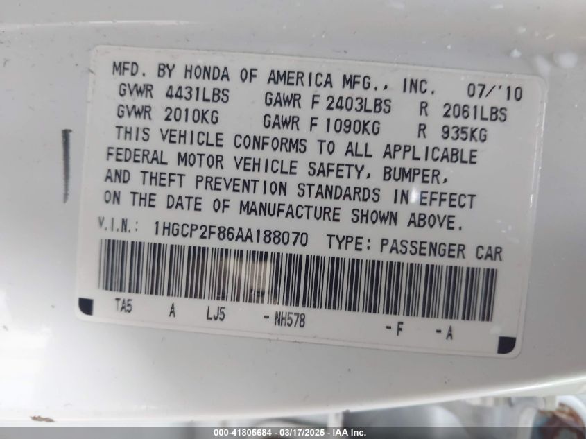 HONDA ACCORD 2.4 2010 р.в., Передній привід (1HGCP2F86AA188070) з США