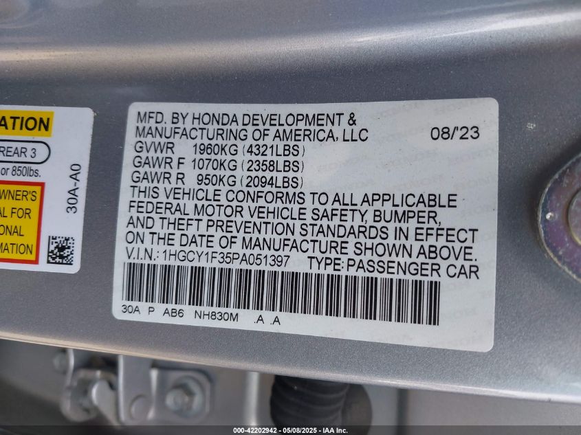 Колір СрібнийЦиліндри 4Привід Передній привідVIN 1HGCY1F35PA051397Стан СтаціонарноУшкодження Передня або задня
