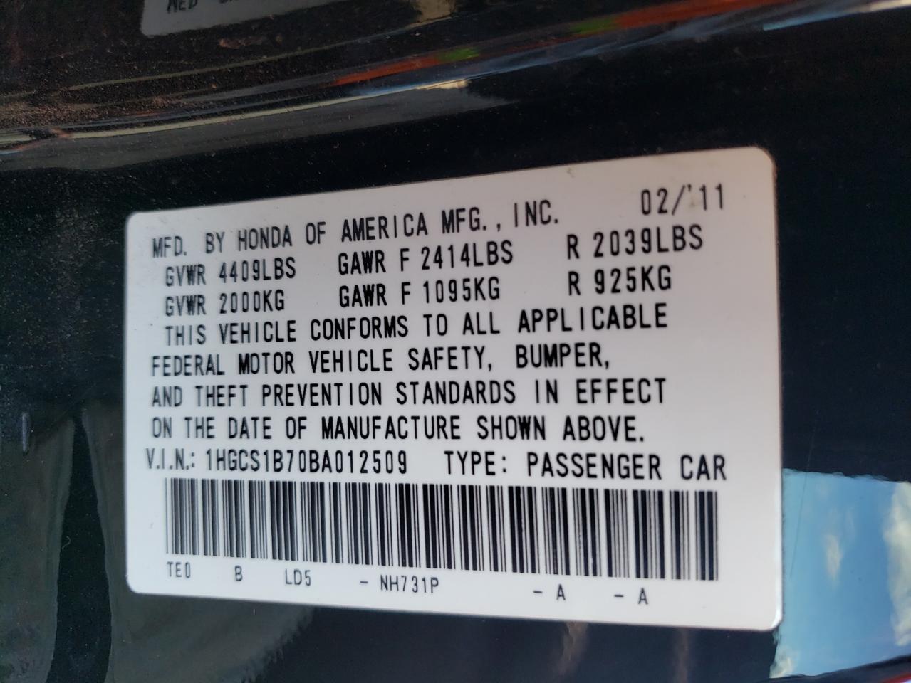 Колір ЧорнийЦиліндри 4VIN 1HGCS1B70BA012509Стан Заводиться та їде (перевірено)Ушкодження ЗадняДата аукціону 2025-11-07