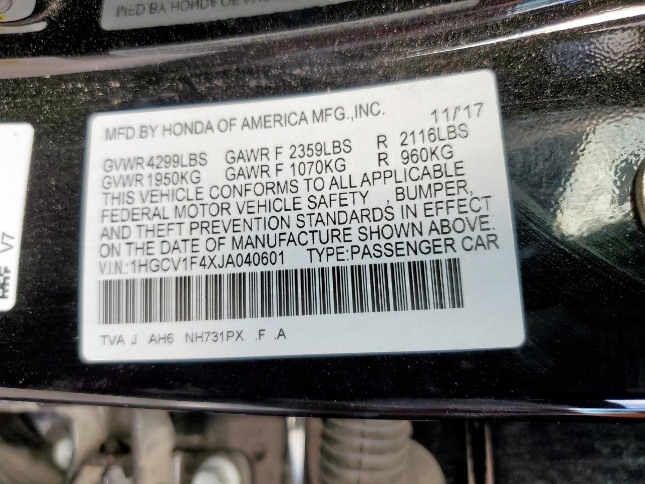 HONDA ACCORD 1.5 2018 р.в., (1HGCV1F4XJA040601) з США
