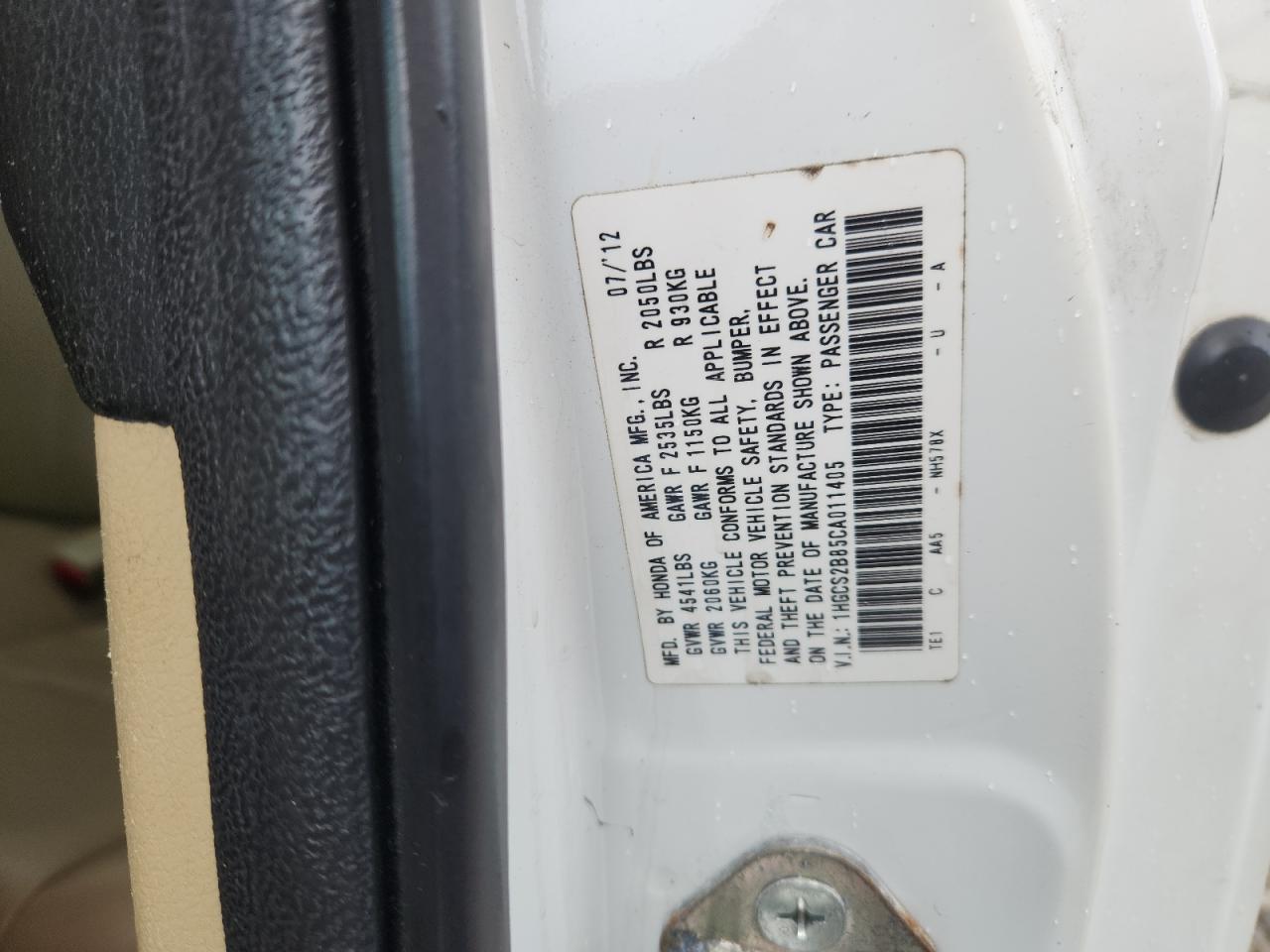 Колір БілийЦиліндри 6VIN 1HGCS2B85CA011405Стан Заводиться та їде (перевірено)Ушкодження Передня або задняДата аукціону 2025-11-04