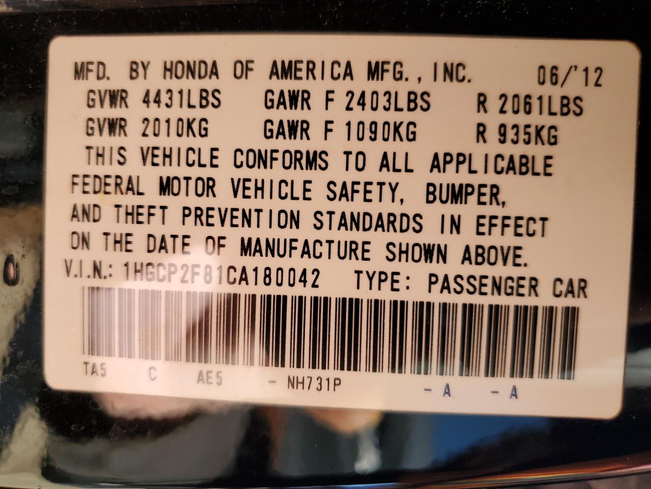Колір ЧорнийЦиліндри 4VIN 1HGCP2F81CA180042Стан Заводиться та їде (перевірено)Ушкодження Задня