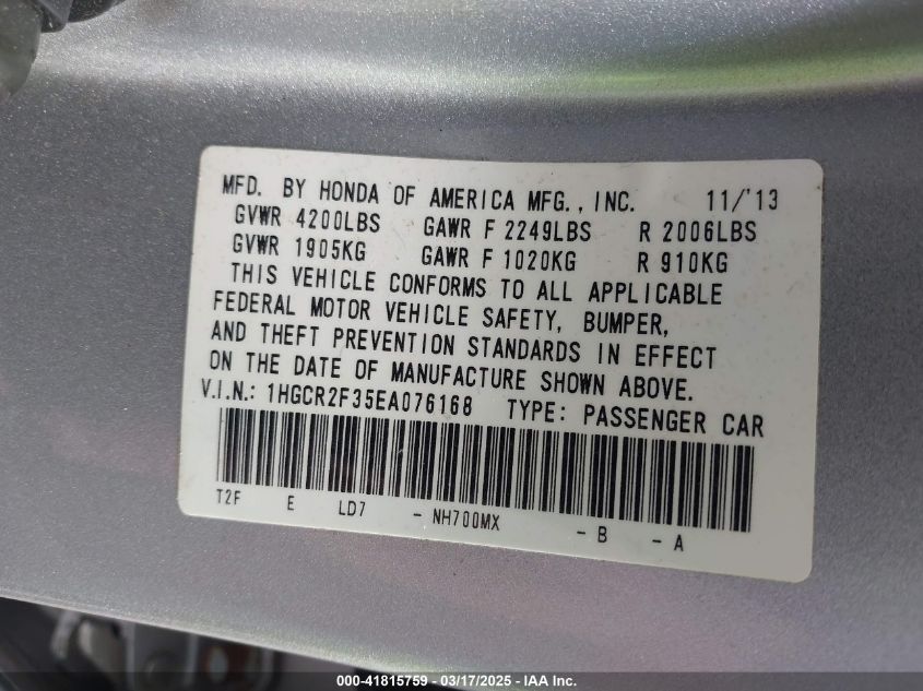 HONDA ACCORD 2.4 2014 р.в., Передній привід (1HGCR2F35EA076168) з США