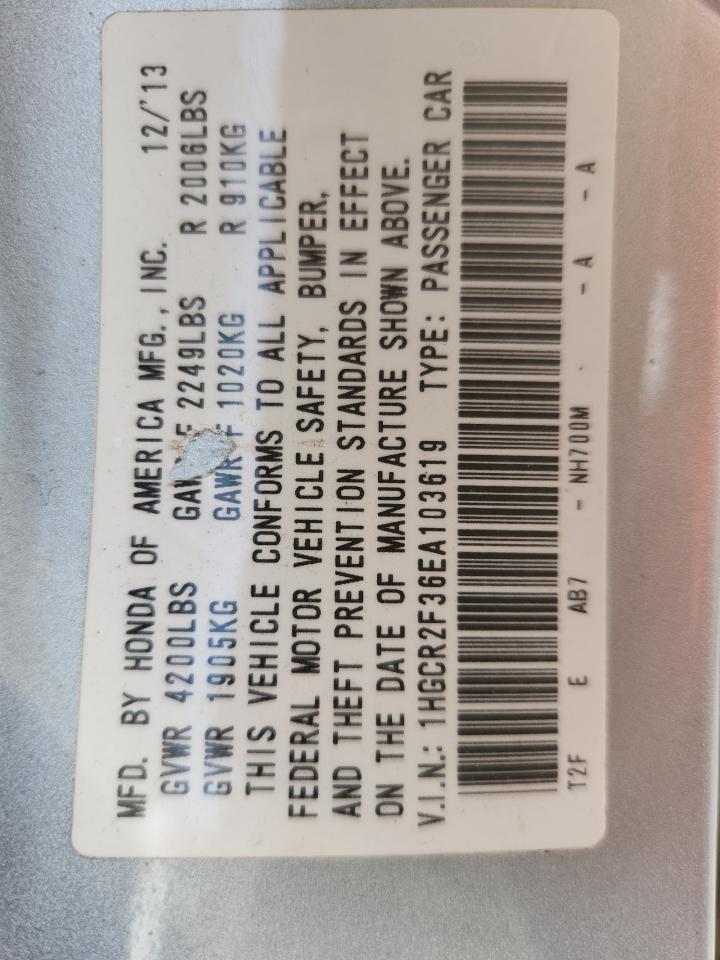 Колір СрібнийЦиліндри 4VIN 1HGCR2F36EA103619Стан Заводиться та їде (перевірено)Ушкодження З боківДата аукціону 2025-11-13