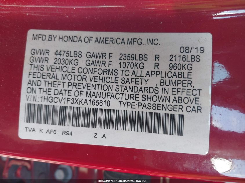 HONDA ACCORD 1.5 2019 р.в., Передній привід (1HGCV1F3XKA165610) з США