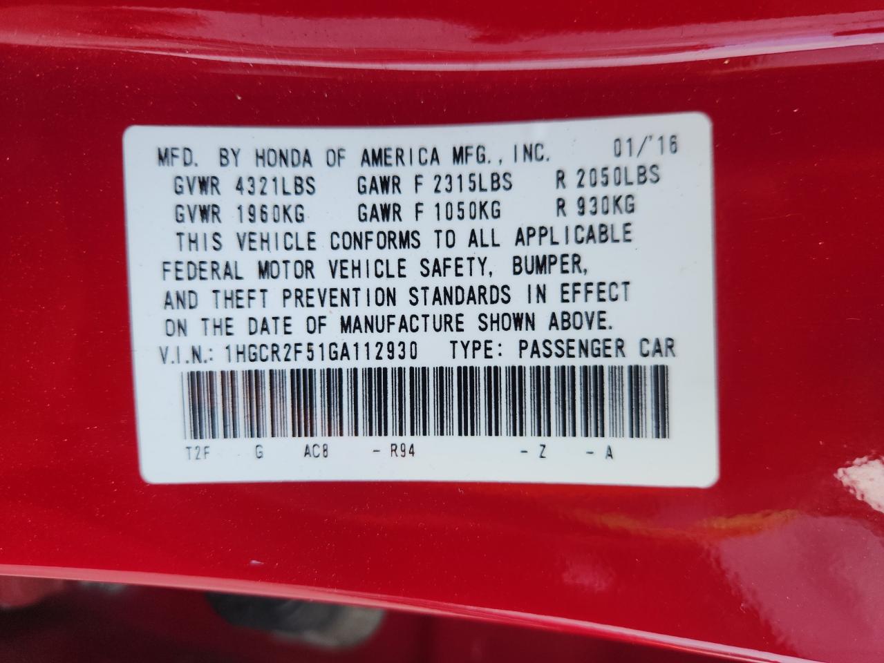 Колір ЧервонийЦиліндри 4VIN 1HGCR2F51GA112930Стан Заводиться та їде (перевірено)Ушкодження ЗадняДата аукціону 2025-11-03