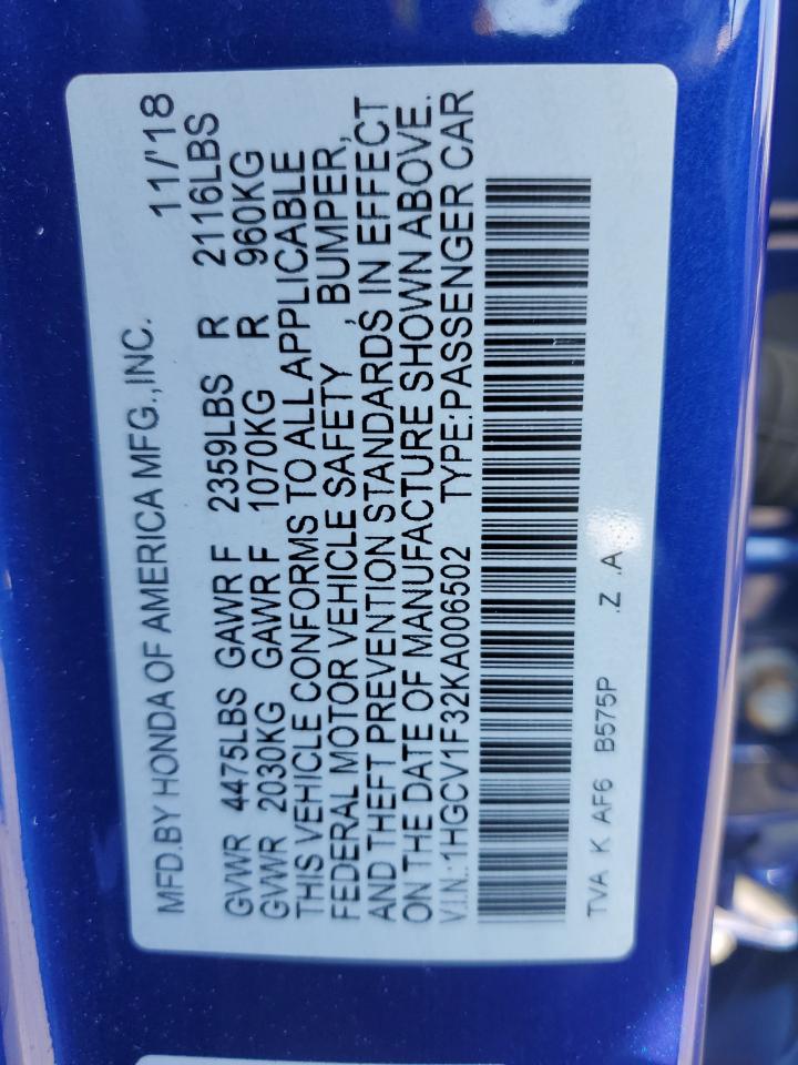 HONDA ACCORD 1.5 2019 р.в., (1HGCV1F32KA006502) з США