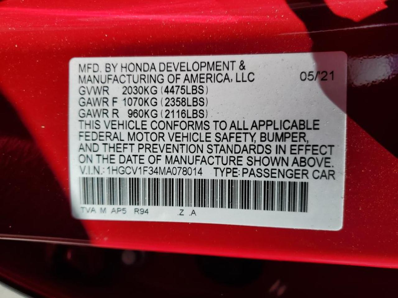 Колір ЧервонийЦиліндри 4VIN 1HGCV1F34MA078014Стан Заводиться та їде (перевірено)Ушкодження Незначні