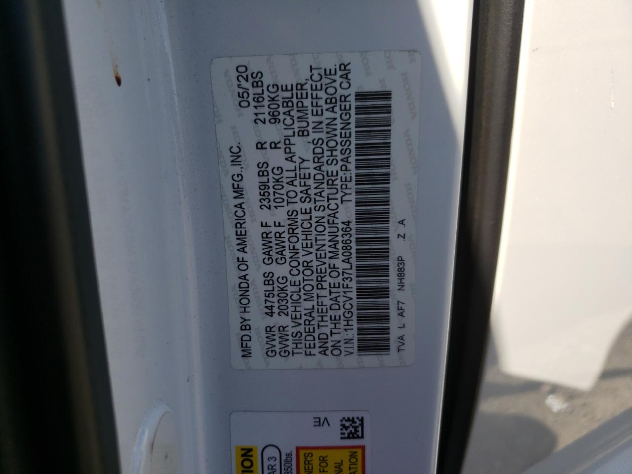 HONDA ACCORD 1.5 2020 р.в., (1HGCV1F37LA086364) з США