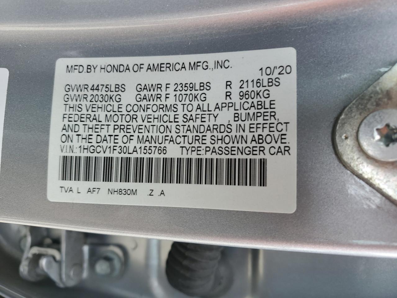 HONDA ACCORD 1.5 2020 р.в., (1HGCV1F30LA155766) з США