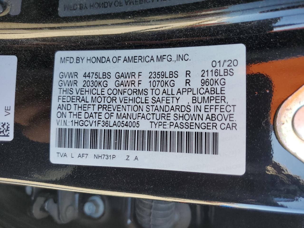 HONDA ACCORD 1.5 2020 р.в., (1HGCV1F36LA054005) з США