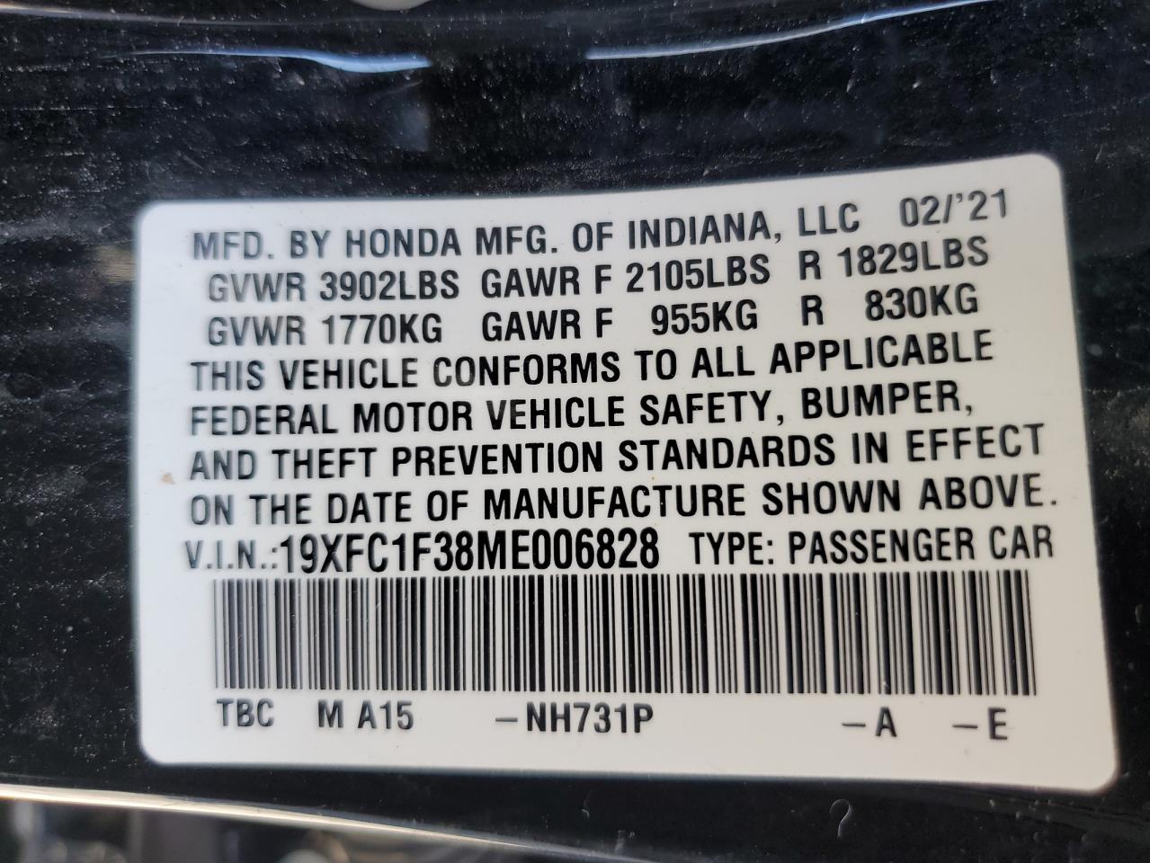 HONDA CIVIC 1.5 2021 р.в., (19XFC1F38ME006828) з США