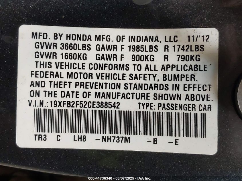 HONDA CIVIC 1.8 2012 р.в., Передній привід (19XFB2F52CE388542) з США