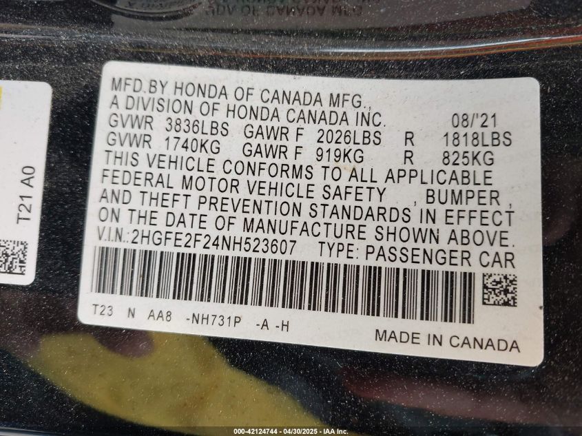 HONDA CIVIC 2.0 2022 р.в., Передній привід (2HGFE2F24NH523607) з США