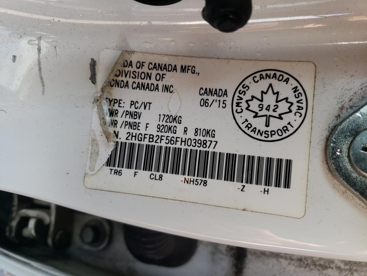 Колір БілийЦиліндри 4VIN 2HGFB2F56FH039877Стан Заводиться та їде (перевірено)Ушкодження Низ
