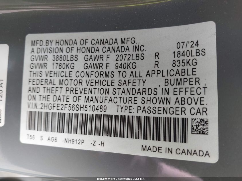 HONDA CIVIC 2.0 2025 р.в., Передній привід (2HGFE2F56SH510489) з США